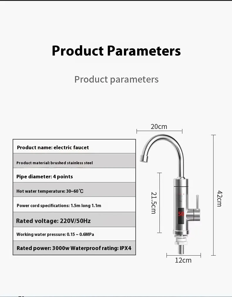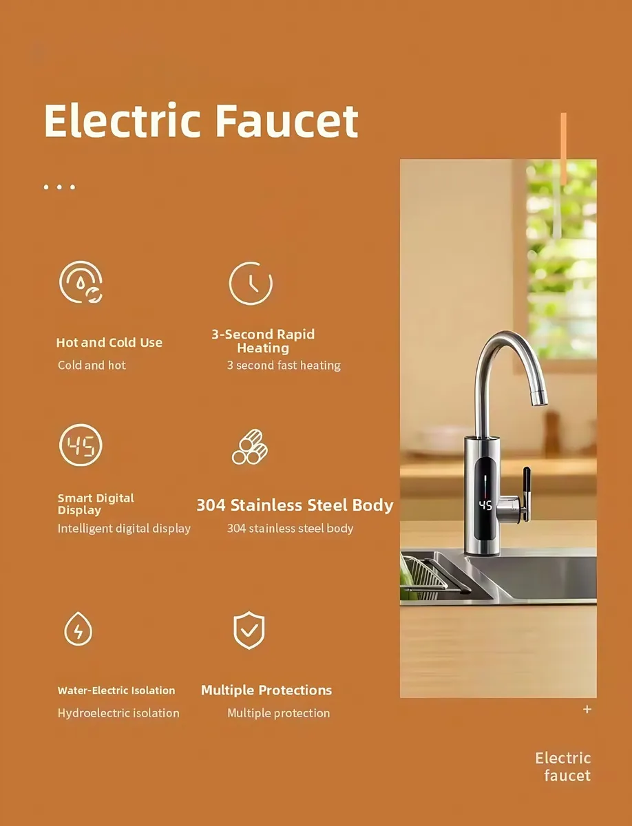 Bathroom Sink Instant Hot Water Faucet 3000W 220V Stainless Steel Electric Kitchen Tap Heater